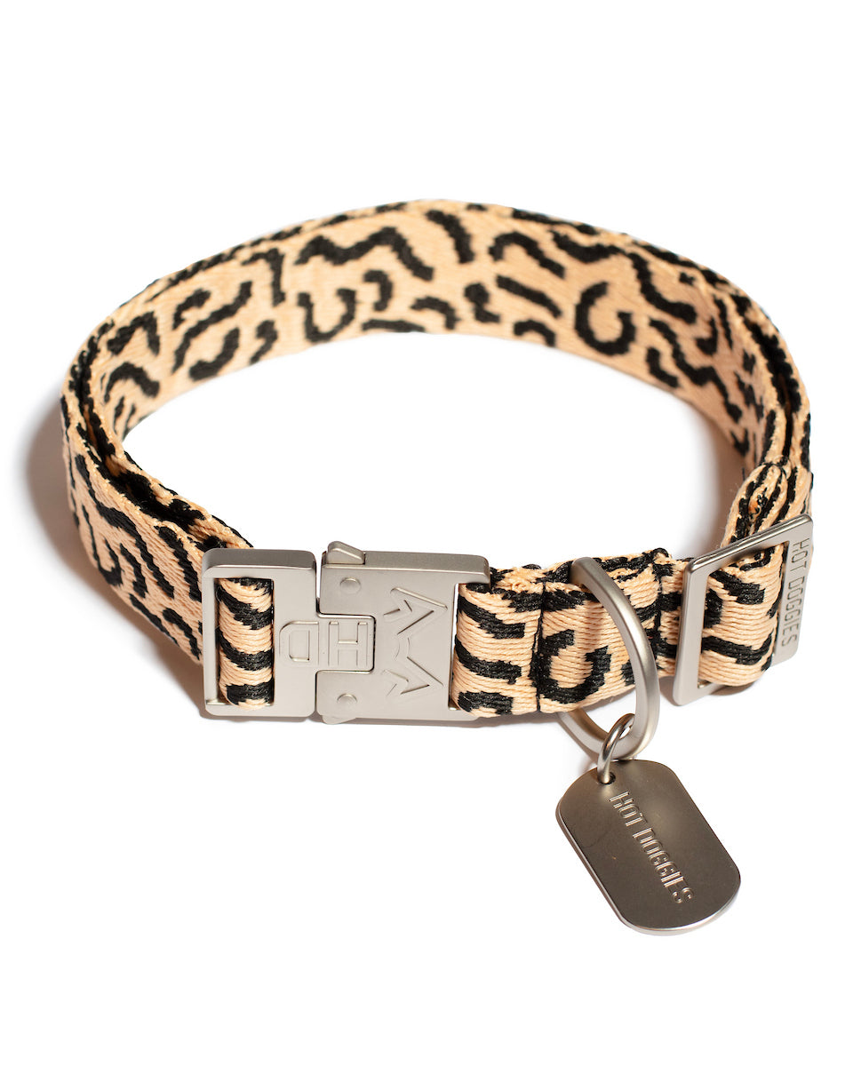 Elevate your dog’s look with the Hot Doggies Coco Noir Collar. Featuring a sleek beige and black design, this collar brings a modern, elegant touch to every walk. Crafted from 100% jacquard woven recycled polyester, it's soft, durable, and eco-conscious. Finished with polished zinc alloy hardware and the signature Hot Doggies logo tag for a clean, sophisticated finish.