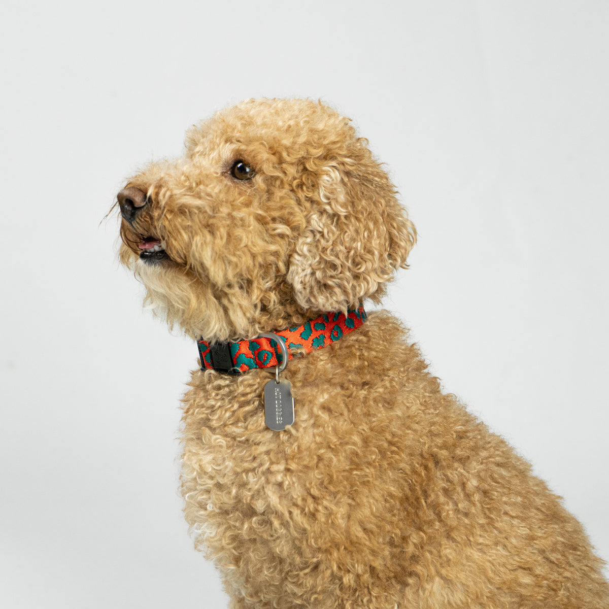 Add bold color and wild style with the Hot Doggies Balloo Collar in green and red leopard. This eye-catching design turns everyday walks into a fashion moment. Made from durable polyester jacquard webbing that keeps its shape and color. Finished with a lightweight YKK plastic buckle and the signature Hot Doggies logo tag.